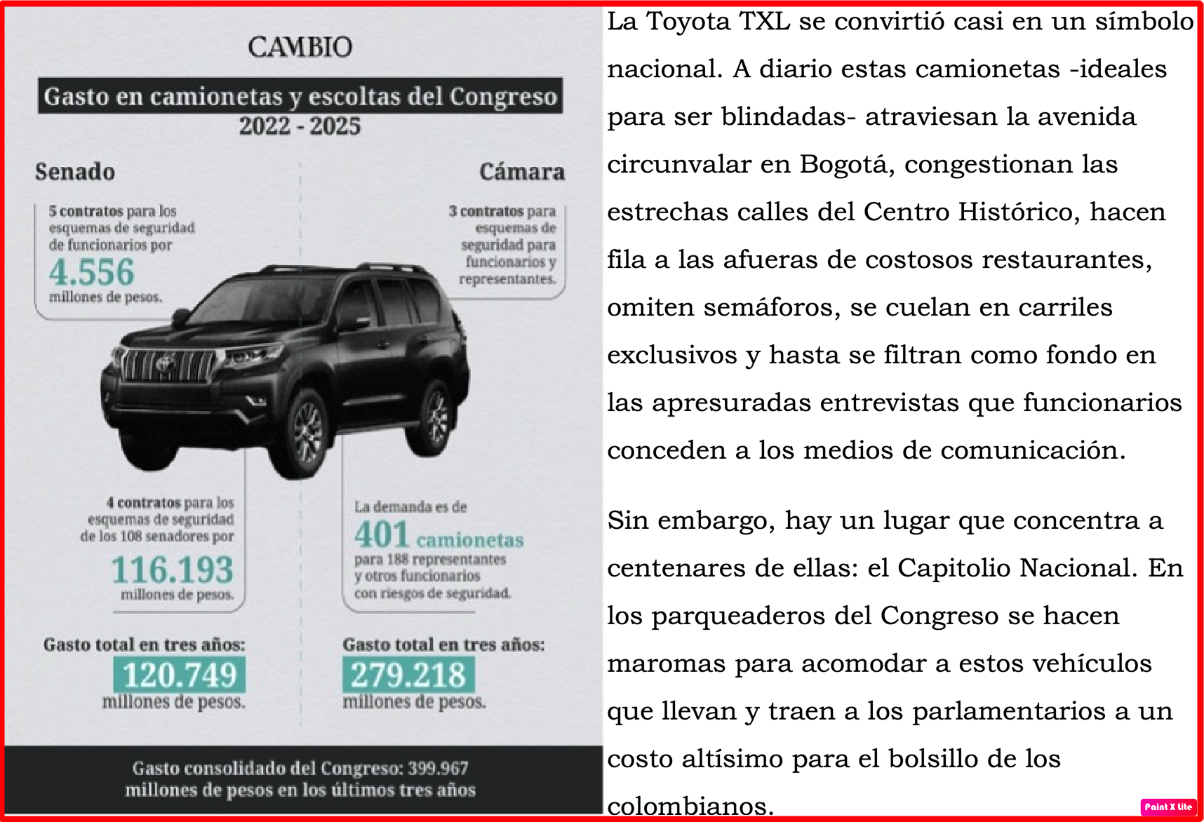 Estos costos se hacen cada cierto tiempo, con dinero de los contribuyentes, para pagar el arrendamiento de 600 vehículos, casi todos camionetas de alta gama, y el pago de igual número de escoltas, para 296 senadores y representantes y más de 20 funcionarios.