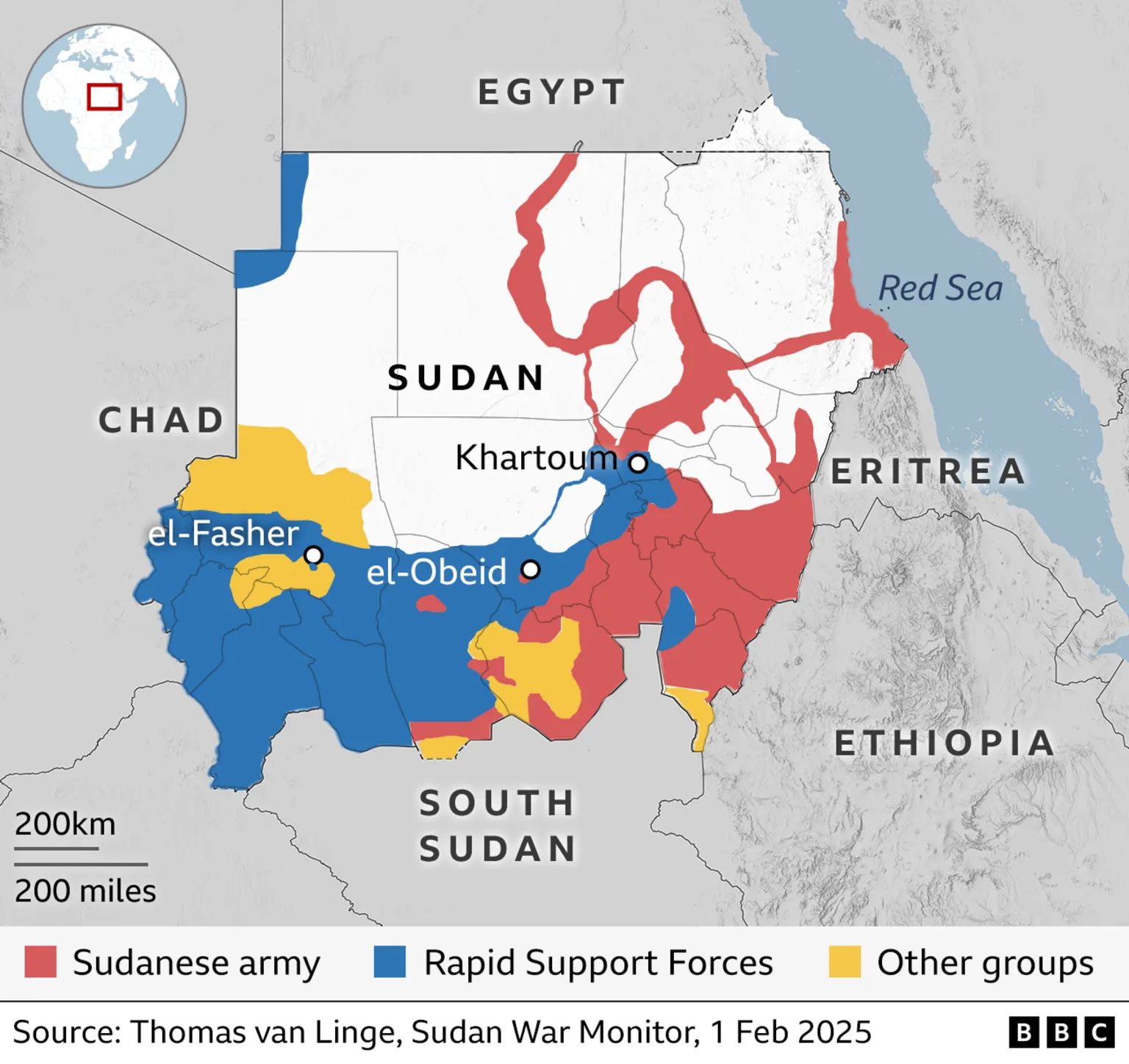 Para Tariq, el recorte de la financiación estadounidense hizo imposible comprar material para las más de 25 cocinas de los seis barrios de la capital, Jartum, a los que ayuda a dar servicio. Según dijo a la BBC, eso no les permitió hacer frente a un empeoramiento de la situación a medida que el ejército avanzaba sobre la zona, que está bajo el control de las RSF desde que estalló el conflicto.