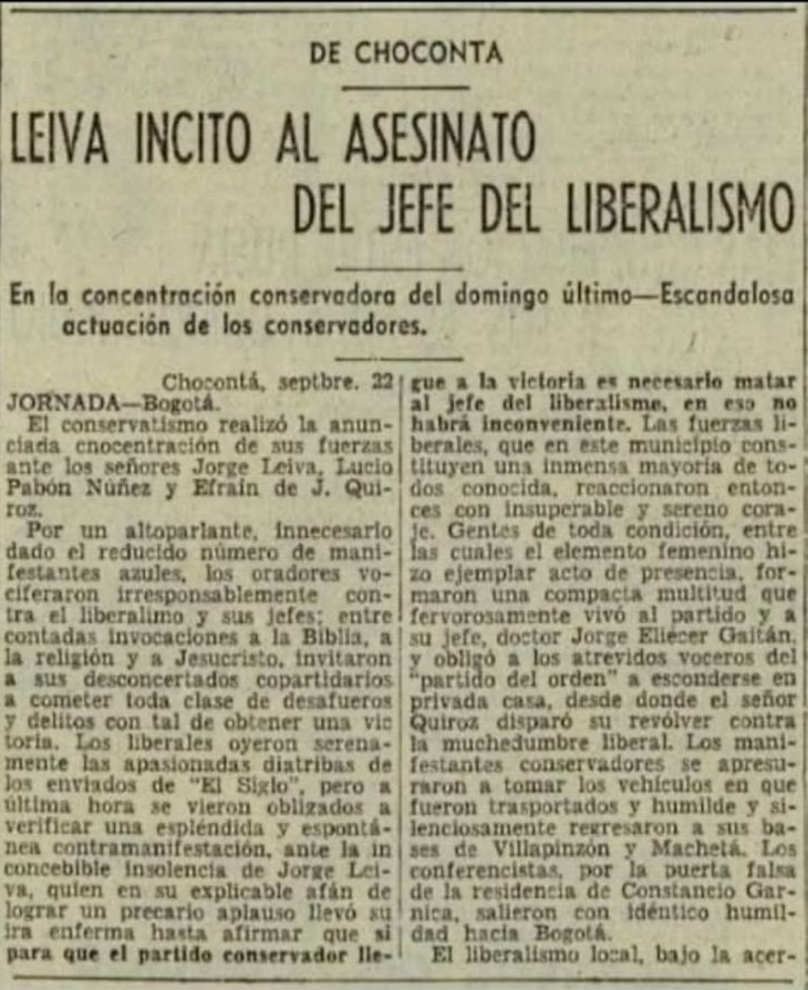 Fue en Chocontá, como lo narra un texto del desaparecido diario Reforma, que defendía las ideas de Jorge Eliécer Gaitán. El acto, para los conservadores del pueblo y del vecindario, era presidido por Leyva, Efraín de JH. Quiñónez y Lucio Pabón Núñez. ‘Pavor’, lo llamaban, con razón, los liberales de la época.